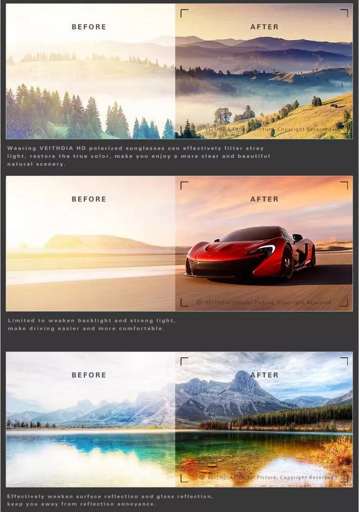 【Materiali leggeri ad alta resistenza】. Abbiamo fatto in modo di riversare il massimo grado di ogni caratteristica nei nostri occhiali da sole polarizzati VEITHDIA. Le nostre lenti sono polarizzate UV 400, resistenti ai graffi e all'acqua. La montatura dei nostri occhiali da sole è realizzata in lega di zinco - l'uso della lega di zinco in generale crea una montatura super resistente, flessibile e leggera.